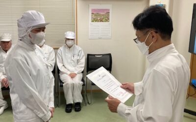2025年10月15日 お祝い 2025年度2Q(7~9月)業務表彰 授賞式を挙行しました。 業務表彰は、真摯な取り組み姿勢が全社員の模範として高く評価された 5名受賞者に、殿岡社長より賞状および記念品が授与されました。